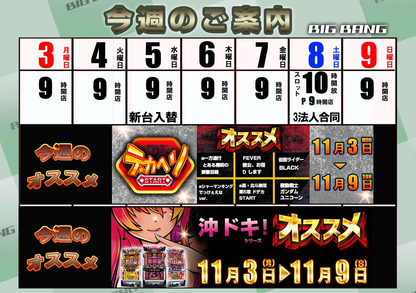 【ビッグバン小樽店】11月4日(火)あさ9時開店 沖ドキシリーズ デカヘソ機種がオススメです。