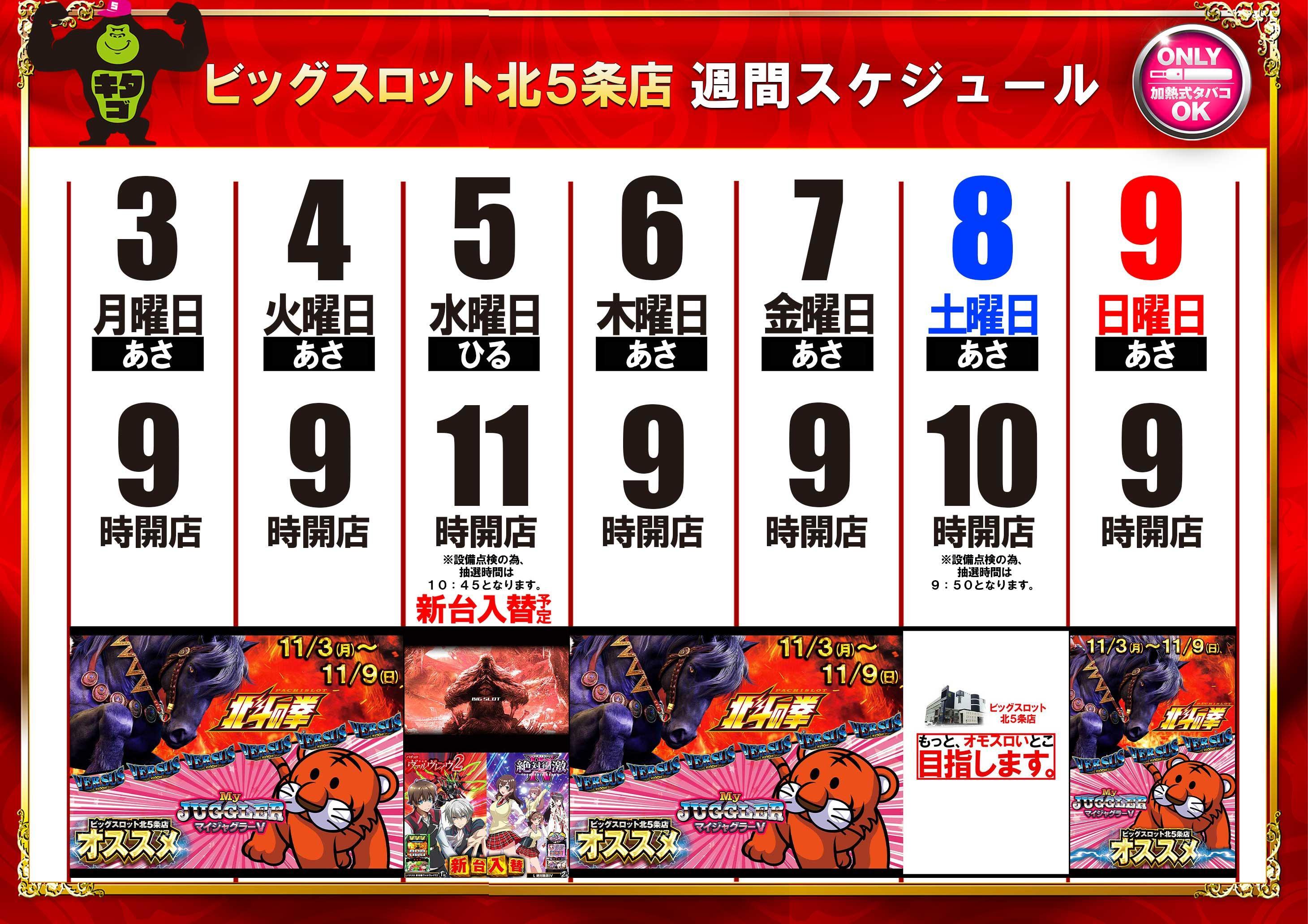 ビッグスロット北5条店 11月4日(火)あさ9時開店☝スマスロ北斗の拳&バーサス&マイジャグラー おすすめ☝