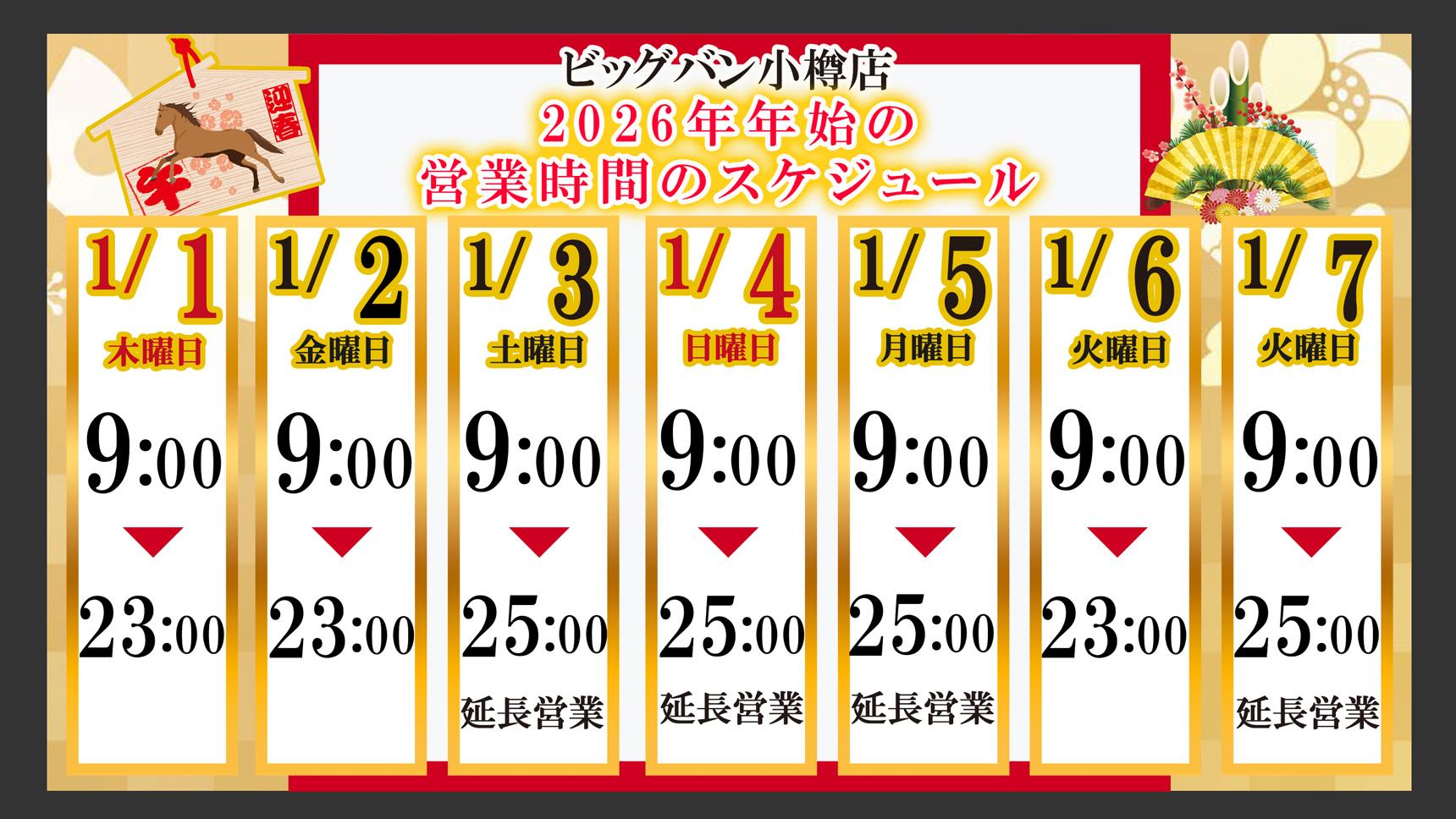 【ビッグバン小樽店】1月3日(土)あさ9時開店 延長営業深夜1時まで